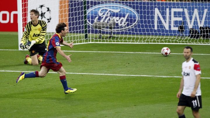 在第70分钟,梅西头球吊射身高接近2米的范德萨成功,最终巴萨2:0战胜曼联夺冠。