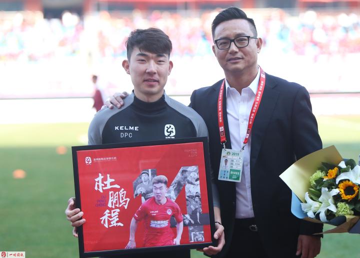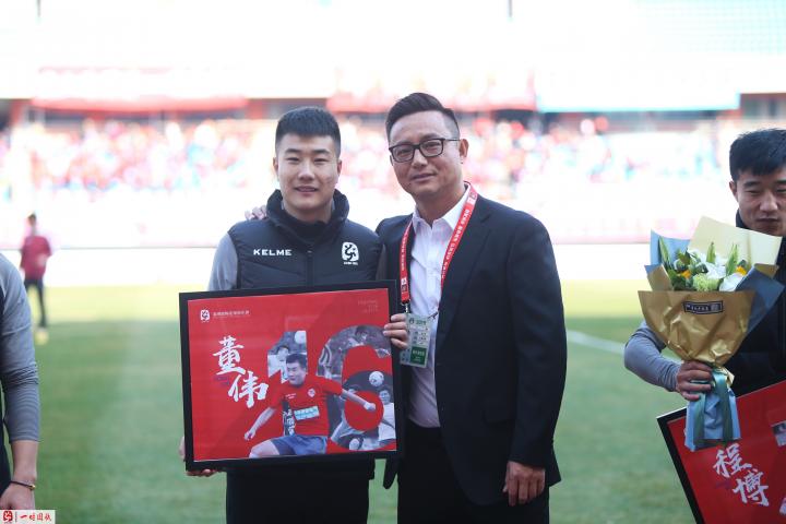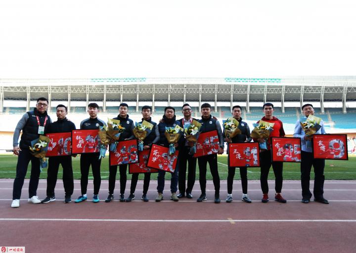 比赛开始前,俱乐部举行了“功勋队员退役仪式”。作为一家有温度的俱乐部,我们邀请了帮助球队从业余联赛冲乙成功的刘梦杨、袁博、程博、王鹏、董伟、王洋、胥少华、李鹏程、杜鹏程9名老队员参加了本次退役仪式,主教练侯志强与领队赵鹏也为各位老队员们献上鲜花与俱乐部精心制作的纪念照片。