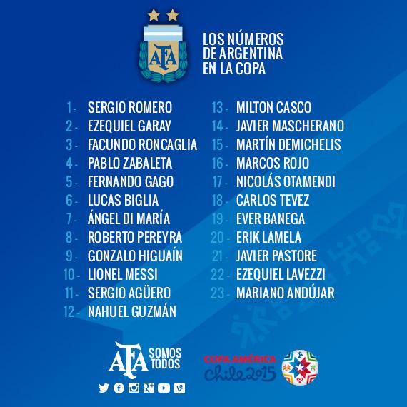 在今年美洲杯的23人大名单中,梅西、伊瓜因、迪马利亚、罗梅罗、德米凯利斯、萨巴莱塔等世界杯主力号码维持不变,阿圭罗由20号改穿11号,安杜哈尔由21号改穿23号。重回国家队的特维斯身穿18号球衣,首次入选大赛的隆卡利亚身穿3号、罗伯托-佩雷拉8号,拉梅拉20号。