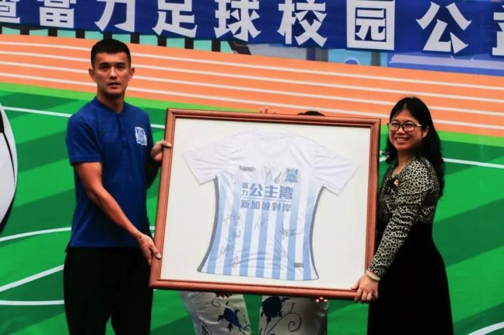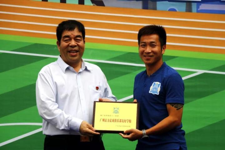 卢琳向学校赠送富力足球俱乐部友好学校牌匾。