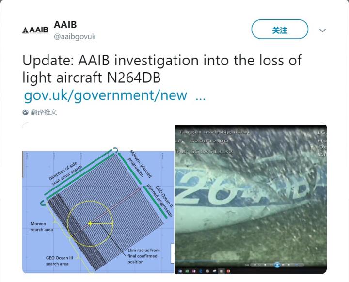 (图)英国航空事故调查局在推特上更新萨拉空难的调查进展 | 图片来源:Twitter