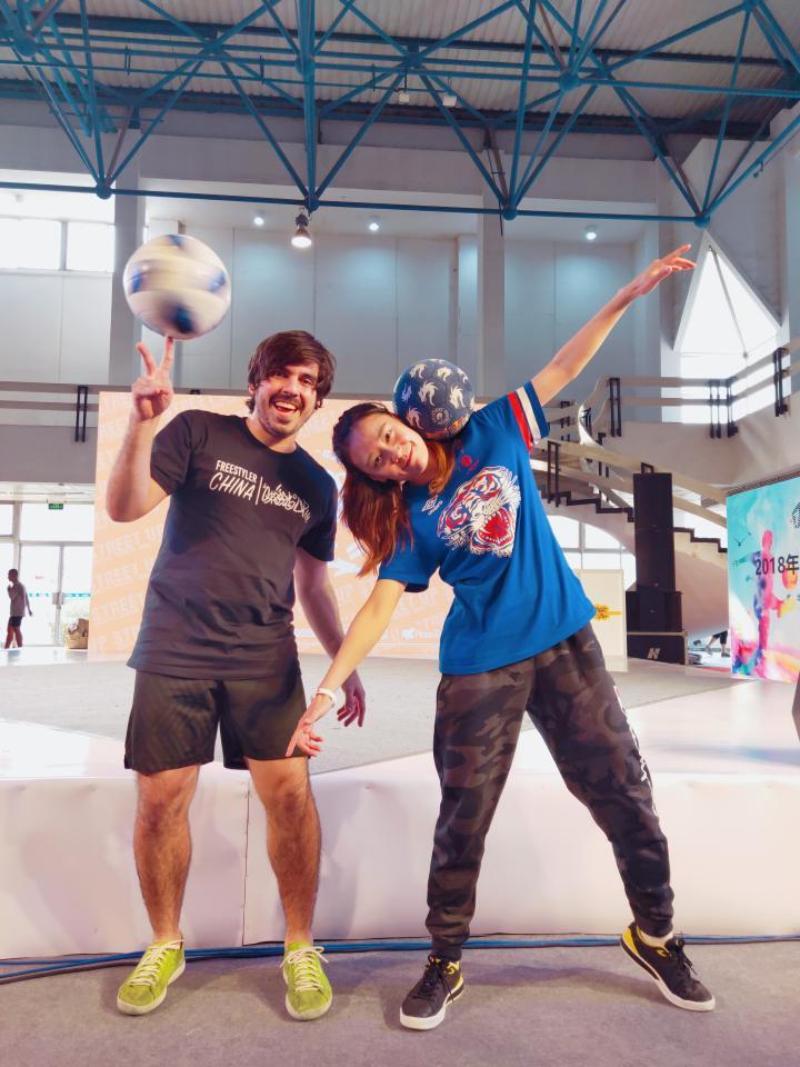 王莎莎参加中国花式精英赛,与裁判、巴西花式足球冠军佩德罗合影