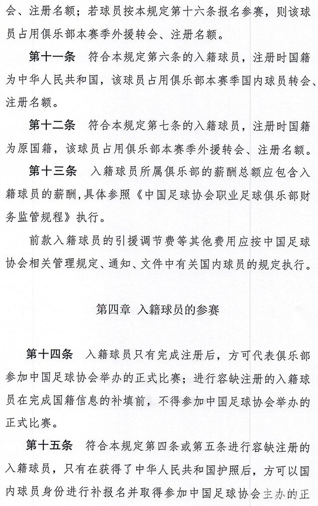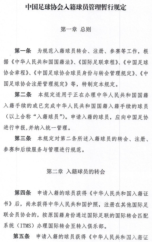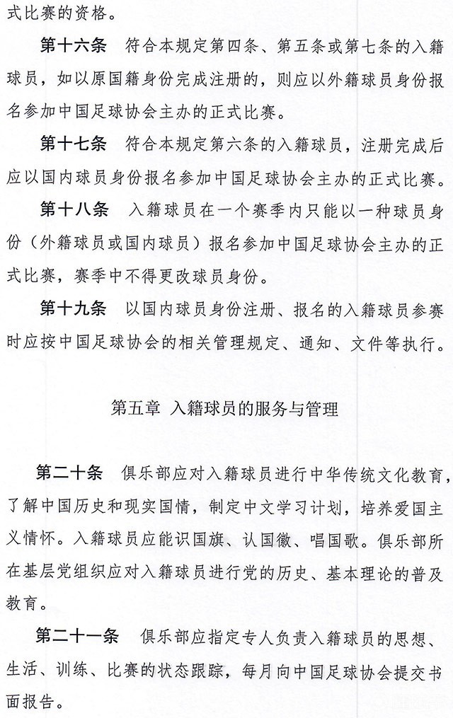文件中还强调,俱乐部应对入籍球员进行中华传统文化教育,了解中国历史和现实国情,制定中文学习计划,培养爱国主义情怀,应能识国旗、认国徽、唱国歌。俱乐部应指定专人负责入籍球员的思想、生活、训练、比赛的状态跟踪,每月向中国足协提交书面报告。