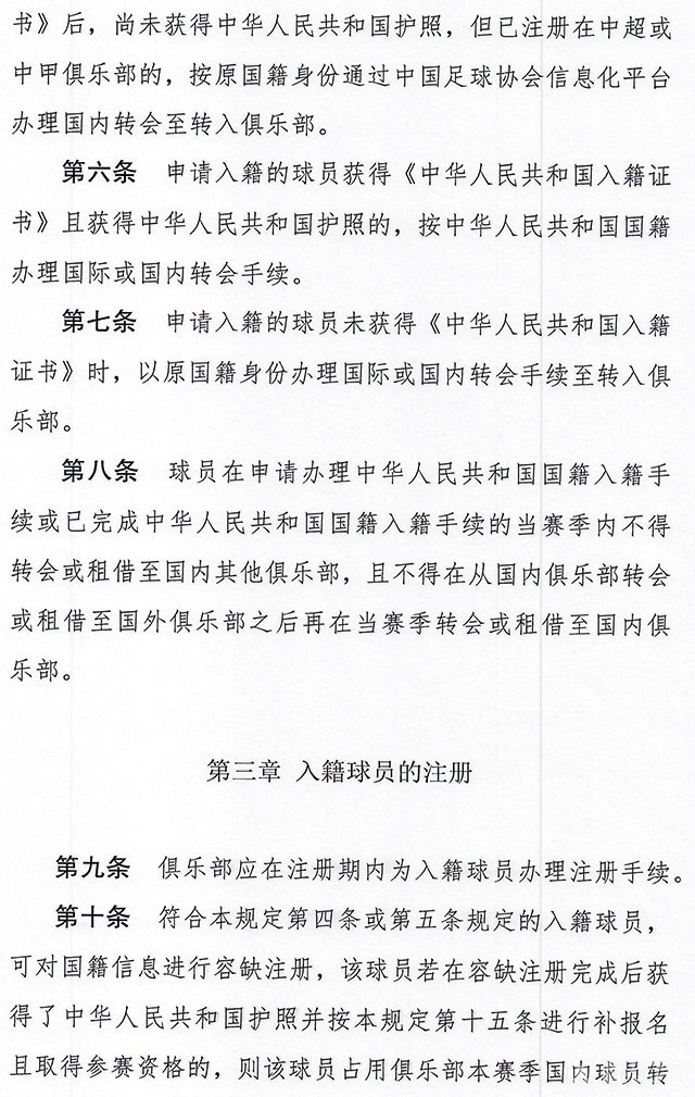 根据足协文件,入籍球员在申请办理入籍或已完成入籍的当赛季不得转会或租借至其他俱乐部,也不能转会或租借到国外俱乐部后再加盟国内俱乐部,即不允许“出口转内销”。