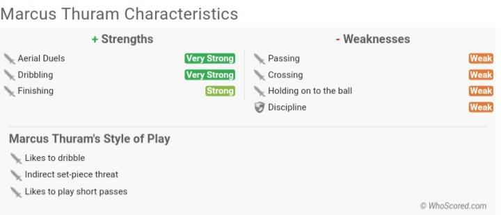 纵观马库斯的技术特点,其盘带能力一直是最大的硬通货,身材高大但是比例合适,步频和脚下变化都不错,且能利用不俗的爆发力和速度完成过人,场均能贡献4次过人,而且在进攻三区也能够持续摆脱,在靠近边线的地方以一敌多更是家常便饭。而他的逆天身体素质也是一大亮点,192cm/86kg的彪悍体格,依然拥有出色的爆发力,速度和灵活性,此外,他的弹跳能力和防守能力也不错,回防次数不少,场均也有1.6次抢断的防守贡献,高空球争顶更是一绝。不过马库斯的弱点也很明显,射术差,缺乏变化的射门技术,力量十足但是总显得多样性一般。而他的球路也偏游击,在边路球路不够宽敞,往往容易把自己带进角旗附近再处理球。此外,他的传中能力也急需提高,难以将球从边路迅速过渡到中路。这也是为什么虽然贵为U19冠军,但是里波利更喜欢班巴担任国青的左边锋。