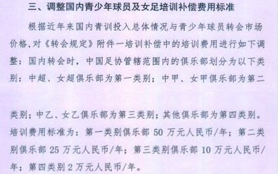 除了“联合机制补偿”,中国足协对于“培训补偿”也接连颁布了措施。2018年初,足协下发了新版的培训补偿费用标准,在原基础上有了极大的提高,球员从12周岁至21周岁期间,培训过该球员的单位均可依据相关注册记录获得国内培训补偿费,第一类别俱乐部(中超、女超)50万元人民币/年;第二类别俱乐部(中甲、女甲)25万元人民币/年;第三类别俱乐部(中乙、女乙)10万元人民币/年;第四类别(业余)2万元人民币/年。