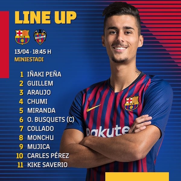 阵容:Iñaki Peña, Guillem (Cuenca, min 90), Araujo, Chumi, Miranda, O.Busquets, Collado, Monchu, Mujica, Carles Pérez (Jandro, min 89) and Kike Saverio (Merveil, min 69)