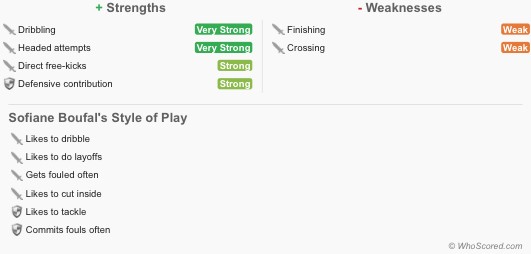 提到法国的北非后裔,我们会想到齐达内,想到纳斯里,本阿尔法,本泽马和费基尔。而出生在巴黎的摩洛哥后裔布法勒,自然也是这样的带球好手。15-16赛季的法甲过人王,拥有极强的个人能力,身高只有175cm的他非常灵活,柔韧性极强,转身动作连贯;而摩洛哥人的盘带技术更是一绝,不同于不少球员依赖速度,布法勒可以说球感爆表,完美利用自己细腻的步频和节奏变化来完成突破,高速盘带过程中能突然变向闪开空档,能扣球急停,布法勒的过人招式颇像本阿尔法,绝对速度和爆发力属于第二档(不错的水准,能闪开空间但距离第一档有差距,不占碾压优势),动作相对简单实用的他往往是依靠频率和灵活性完成过人,而在高速盘带时做出油炸丸子也是家常便饭。本赛季来到塞尔塔后,摩洛哥国脚主要出现在左边锋位置,负责球队的推进和前场关键区域的拿球闪开空间制造威胁的任务。本赛季目前为止他的数据不算出色,2球2助攻,不过过人作用可谓显现的淋漓尽致。场均4.4次过人成功,成功率达到了66.7%;总计117次盘带成功排名五大联赛第一,可以说布法勒在塞尔塔找回了过人的感觉。