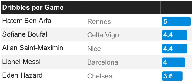 欧洲本赛季五大联赛的平均过人次数,布法勒排名第二,总次数第一(图)