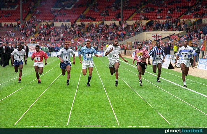 1992年联赛杯决赛在诺丁汉森林与曼联之间进行,从某种意义上讲,Rumbelows短跑挑战赛就像那场决赛的一档助兴节目。诸位设想一下,若是能在某场比赛前看到贝莱林、瓦尔迪和萨拉赫等英超联赛的速度狂魔在跑道上你追我赶,岂不美哉?