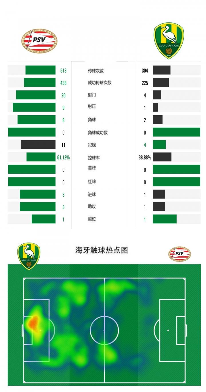 比赛大部分时间都是保持在埃因霍温1:0领先的情况下。兹文克尔斯用非常敏捷的反应阻挡了德容的射门,但还是无法阻挡邓弗里斯在比赛第20分钟从右侧内切入进去并用左脚射门取得进球。埃因霍温用精彩的进球取得了实至名归的领先优势。但海牙队依旧保持着希望。
