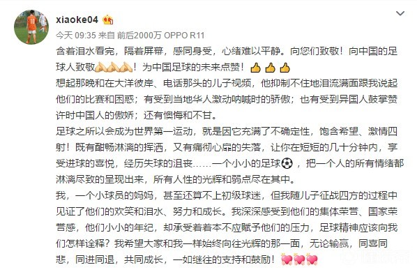 赛后,国少队长何小柯的妈妈在微博上表达了自己的激动之情:“向中国足球人致敬!为中国足球的未来点赞!”