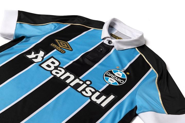 醒目的白色Polo衣领与衣袖上宽大的白色条带让这件新战袍看起更具古典主义,衣领内加入格雷米奥球迷众生相的金色图案,表达球队与球迷间密不可分的关系。