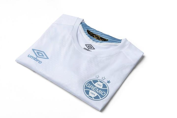 格雷米奥新赛季客场球衣拥有干净的白色外观,球衣上加入umbro钻石花纹形象的立体条纹,球衣身体两侧加入拥有球队名称“Grêmio”字样的天蓝色条带。客场球衣胸前队徽同样采用质感与细节兼备的热压印工艺打造,并且以天蓝色外观呈现,以此展现俱乐部一百多年来所恪守的传统。