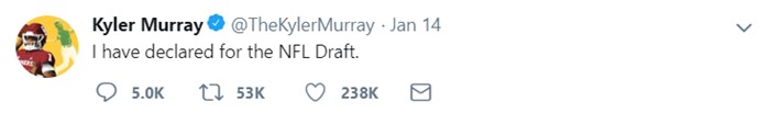 不过,凭借出色的发挥,穆雷拿下了2018年的美联社年度运动员奖和海斯曼奖杯,还成为2019年NFL选秀大会的状元热门。因此,穆雷开始动摇了。