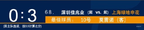 足协杯官微确认,由于深圳佳兆业在足协杯与上海绿地申花的比赛中只派了两名U23球员上场,深圳被判本场比赛0-3负。这也是U23政策实行以来,首次有俱乐部因为一线队未按规定派U23球员上场而被判0-3负。