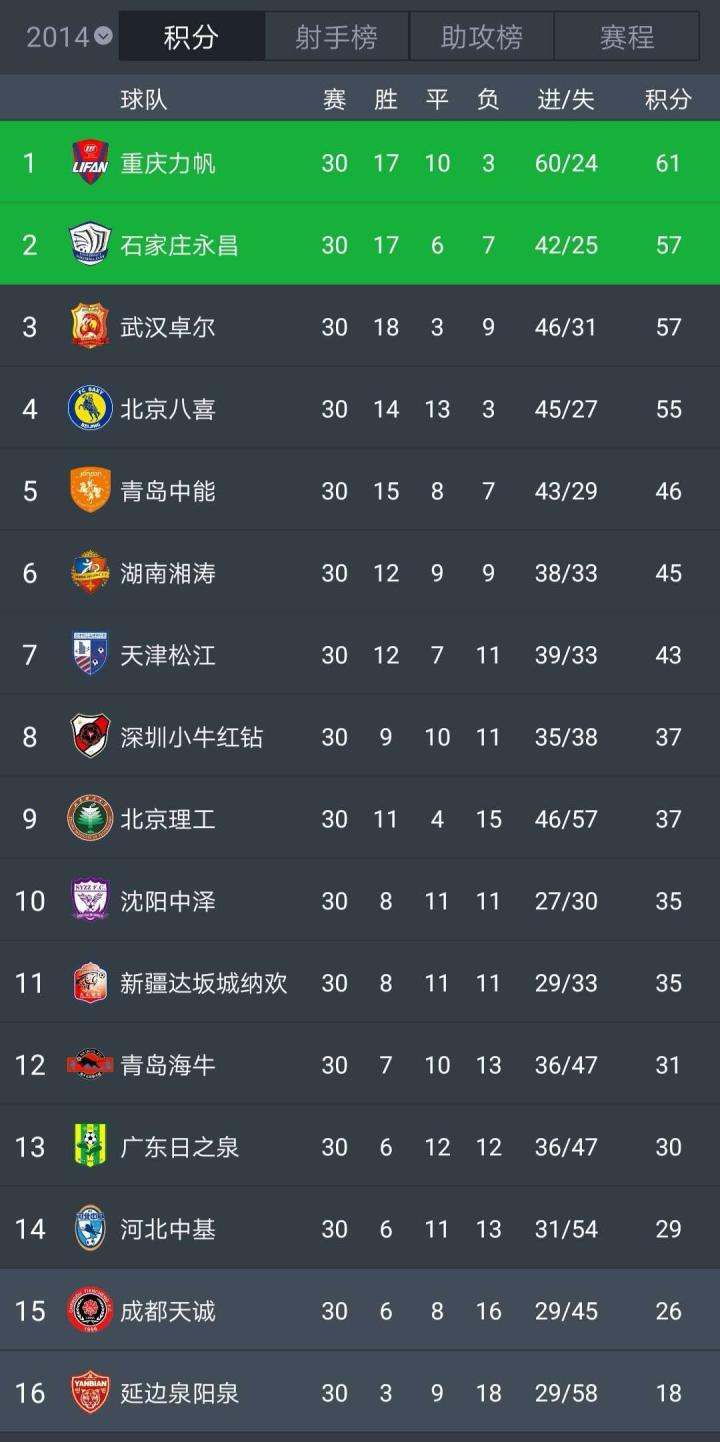 (在2014赛季的中甲联赛中,两支青岛队分别获得第5和第12名的成绩)
