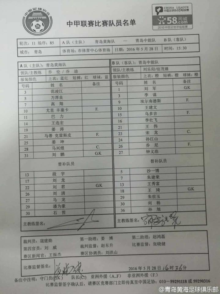 (黄海3:2中能比赛的球员名单,当值主裁是著名裁判窦建勋)