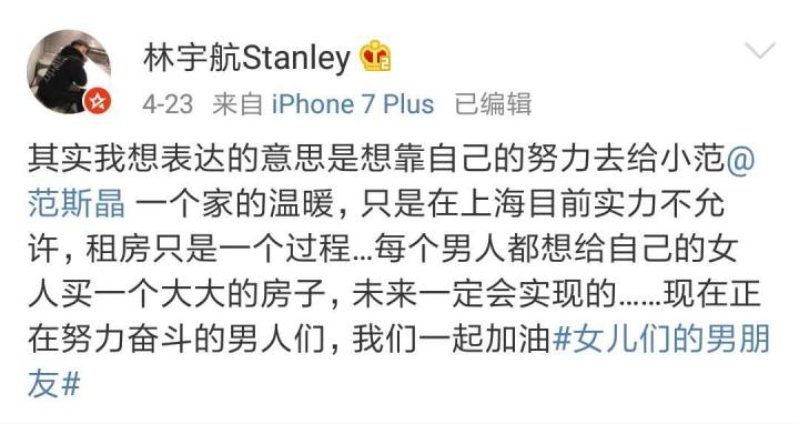 对此,林宇航本人在微博上做了解释,“其实我想表达的意思是想靠自己的努力去给小范一个家的温暖,只是在上海目前实力不允许,租房只是一个过程…”