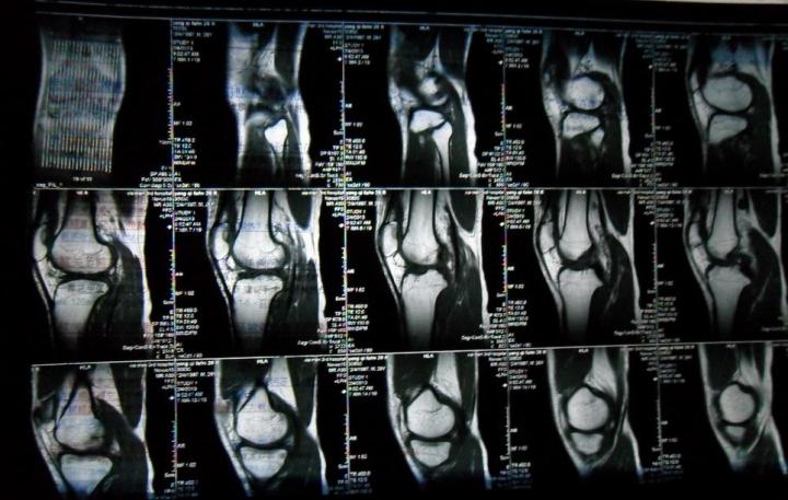 其实在拍核磁共振之前,医生还有一个“手动”初步判断的方法。这里我也做一个分享:用大拇指按压膝关节间隙,如果是内测间隙疼痛,那么受伤的极有可能是内侧半月板;外侧间隙疼痛则可能是外侧半月板受伤。医生手动判断的结果就是我的内侧半月板损伤,核磁共振的结果也相同。