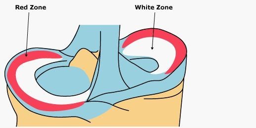 半月板中间的区域称为白区,白区没有血液供应,只能任由其自生自灭,任何的“灵丹妙药”都没有途径和渠道送达,所以,白区的半月板损伤几乎都是不可逆的。