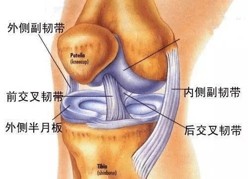 膝关节主要有四条主要韧带。在膝关节内部有前十字韧带和后十字韧带,这两条韧带主要控制膝关节的前后运动稳定性;膝关节内测有一条内侧副韧带,外侧有一条外侧副韧带,这两条韧带主要控制膝关节内外方向的稳定性。人体大腿的骨干和小腿的骨干连接、人体完成小腿屈伸的动作,主要就是靠四条韧带的“通力合作”。