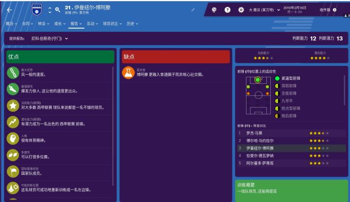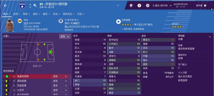 从博阿滕的位置属性来看,这名加纳球员最适合的位置还是前锋,在此基础上他还能够胜任左右两个边锋的位置。虽然从资料显示,博阿滕的主力脚为右脚,但通过他的比赛视频来看,E-博阿滕的左右脚非常均衡,不管是拿球还是射门,博阿滕的左脚并不比右脚差,从后卫防守的角度,左右脚均衡的球员将更加难以防范。在FM中,博阿滕的CA为129,PA已经固定为142,这样的属性在中超联赛并不起眼,甚至可以说是中下等标准,毕竟越来越多的大牌球员被中超吸引,与胡尔克,巴坎布,扎哈维这样的明星球员相比,年轻的E-博阿滕还比较青涩,他的CA与PA也没有展现出非常可期的即战力或者潜力。
