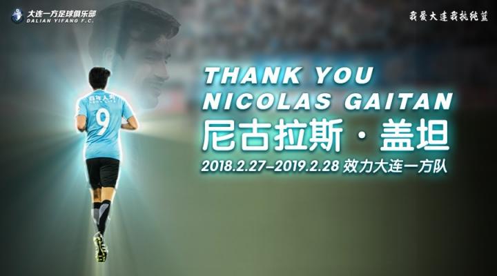 从俱乐部整体规划以及长远发展的角度综合考虑,经与球员本人协商一致,外援尼古拉斯·盖坦加盟美职联芝加哥火焰队。对盖坦效力大连一方时期为球队做出的贡献,俱乐部表示衷心感谢。